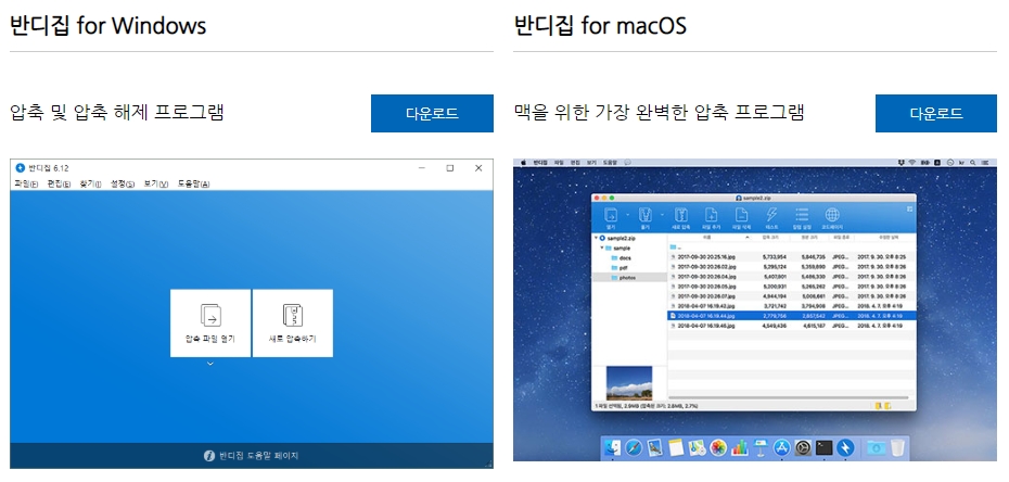 위에서 두번째에 위치한 반디소프트를 클릭하면 위와 같이 화면이 나온다. 여기서는 반디집 윈도우 버전, 반디임 맥 버전, 꿀캠, 꿀뷰 다운로드 페이지로 넘어가는 화면이 있다. 만약, 본인이 위처럼 검색 결과에 나온 페이지 중 첫 번째를 클릭했다면 이런 화면은 없을 것이고 바로 꿀뷰를 다운받을 수 있는 화면이 보일 것이다.