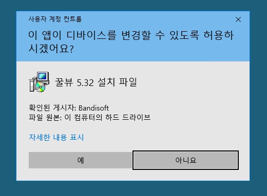 홈페이지에서 꿀뷰 파일을 다운받고 실행을 하면 꿀뷰 5.32 설치 파일 실행 안내문구가 뜬다. 관리자 권한을 가지고 있다면 바로 실행되겠지만 나처럼 관리자 권한을 따로 부여한 경우에는 예 버튼을 눌러서 실행하도록 한다.