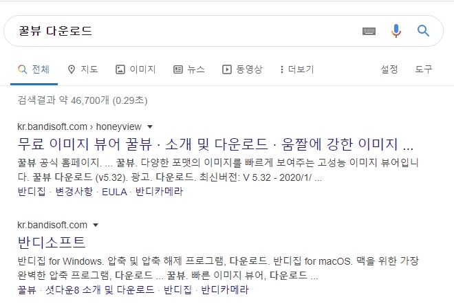 프로그램을 다운로드할 때는 어떤 블로그가 아닌 공식 사이트에서 받는 것이 제일 좋다. 그래야만 바이러스로부터 내 컴퓨터를 보호할 수 있기 때문이다. 그냥 그런 게 귀찮다면 대충 블로그에 올라온 거 꿀뷰 같은 파일 다운로드하고 훅 가면 된다. 먼저 본인이 사용 중인 브라우저를 열어서 검색 포털에 들어간다. 검색 포털은 네이버, 줌, 다음, 구글, 야후, 바이두 등등 어디든 상관이 없다. 위 사진처럼 꿀뷰 다운로드를 검색한다.