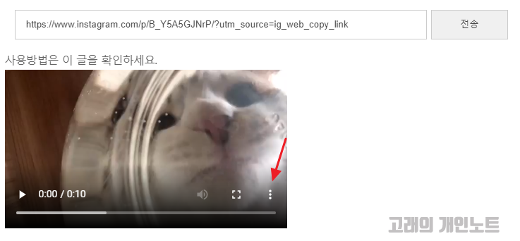 동영상 다운로드도 간단합니다. 인스타그램에서 동영상 주소를 복사한 다음 입력하시고 전송을 누르면 동영상 파일이 올라올텐데 화살표 방향에 위치한 아이콘을 눌러서 동영상을 저장하실 수 있습니다.
