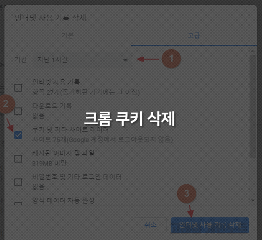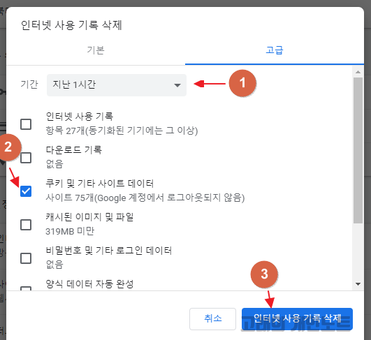 2. 인터넷 사용 기록 삭제 기능이 표시되면 고급 탭을 선택하고 쿠키를 삭제할 기간을 선택합니다. 이어서 체크 박스에 쿠키 및 기타 사이트 데이터를 클릭하고 인터넷 사용 기록 삭제를 누르면 크롬에서 쿠키가 삭제됩니다.