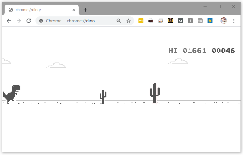 몇년전에 구글은 크롬 브라우저에 이스터에그 게임인 공룡 게임을 추가 했습니다. 인터넷이 연결이 되지 않는 상태에서 브라우저를 실행후 사이트를 방문하려고 하면 "인터넷을 연결할 수 없습니다." 라는 메시지가 나오는데 그 위에 공룡이 위치한 것을 알 수 있습니다.