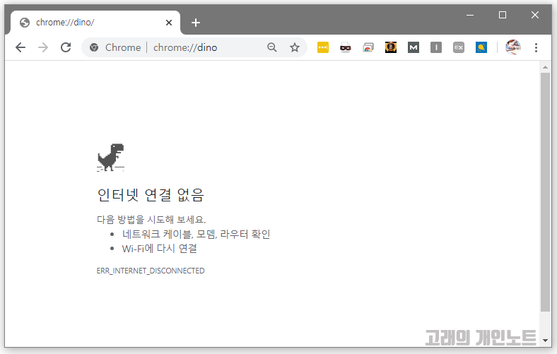 2. 인터넷 연결 없음 메시지와 함께 크롬 공룡 게임 시작 준비화면이 보이게 됩니다.