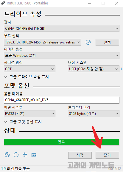 윈도우10 USB 만들기 위한 Rufus 설정