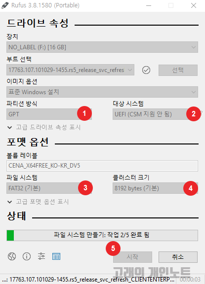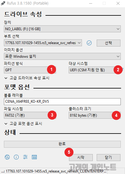 파티션 방식, 대상 시스템, 파일 시스템, 클러스터 크기는 두 가지의 선택지가 있습니다. 요즘 컴퓨터들은 대부분 UEFI 방식을 사용하고 있기 때문에 최근에 컴퓨터를 구입하셨다면 위 설정 그대로 진행해도 됩니다. 만약 2016년도 이전에 구매한 컴퓨터일 시 메인보드가 UEFI를 지원하지 않을 가능성이 다분합니다. 본인의 메인보드에 따라서 설정을 달리 해야 합니다. 설정은 다음 안내를 참조하세요.