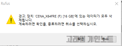 1. 위에서 안내해드린 대로 Refus 설정 후 "시작"을 누르면 윈도우10 USB 부팅 디스크를 만들기 위해 USB 장치를 초기화한다는 안내 메시지가 표시됩니다. 확인을 누릅니다.