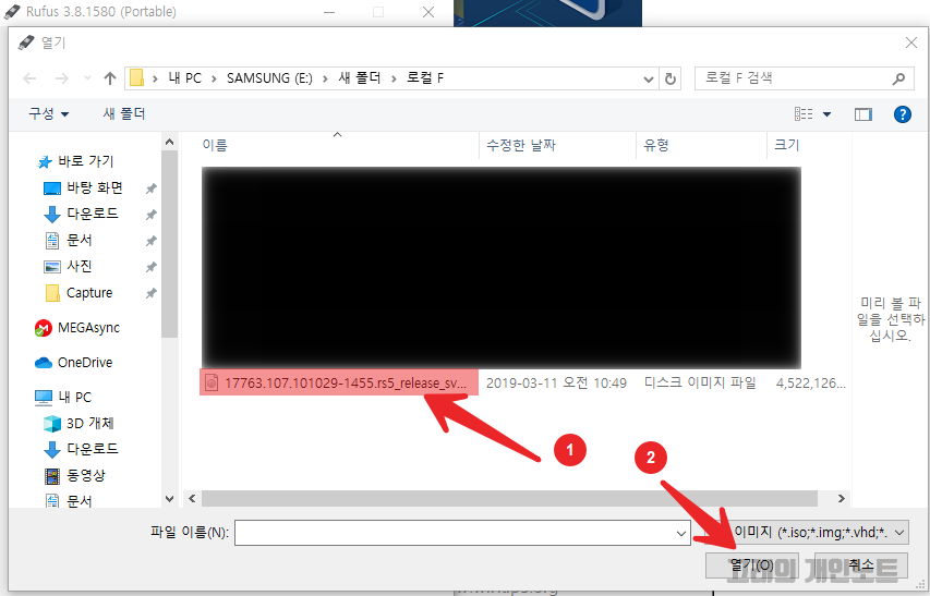 2. 선택 버튼을 눌러 윈도우 ISO 파일이 있는 경로로 이동하여 다운로드한 ISO 파일을 선택합니다. 이제 USB 부팅 디스크를 만들기 위한 설정을 진행해야 합니다.
